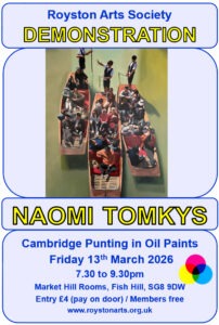 We offer our members a variety of art related activities including painting sessions, artist demonstrations and exhibitions as well as providing regular news about local art-related activities. Our members come from towns and villages within 25 – 30 miles of Royston. They include relative beginners and experienced amateur or professional artists. We all like to share our enjoyment in creating art.