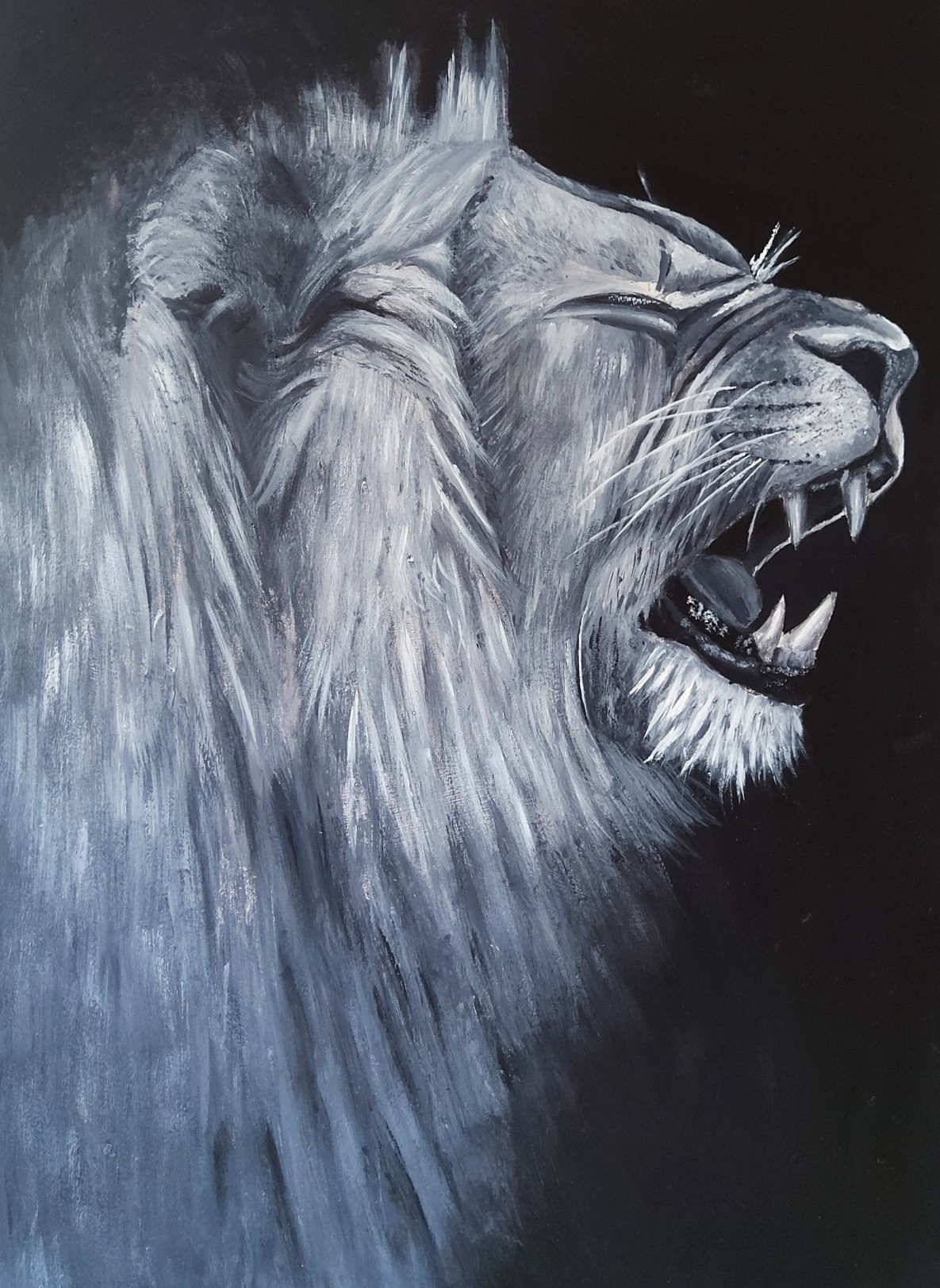 Richard Clayton: Black and White Lion – £65 (Acrylic on Board, 43cm H x 32.5cm W, Framed)